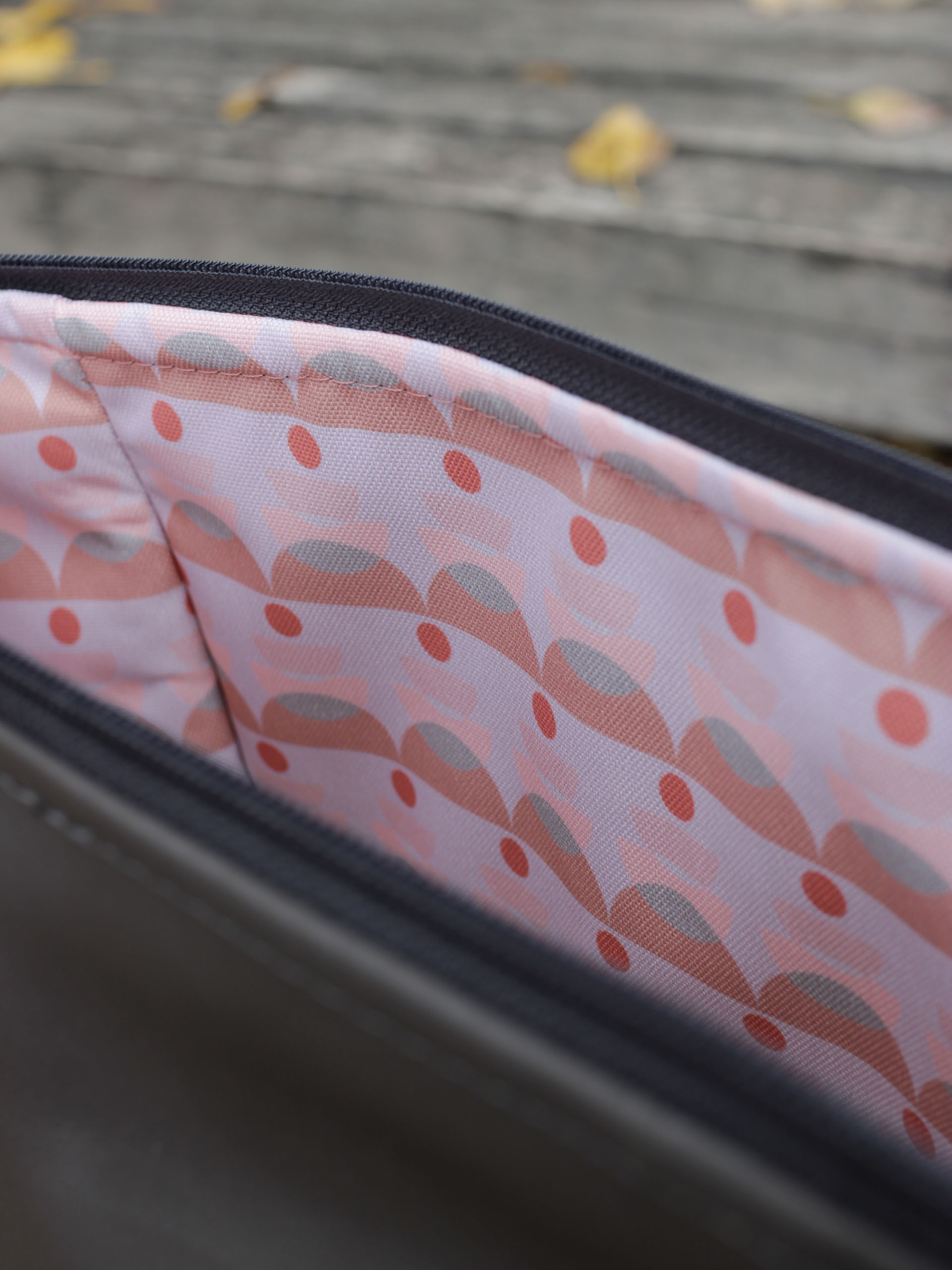 Belsejében kulcstartó karabiner és 2 nyitott és 1 nagy cipzáros zseb található. Elején lévő zseb 26×22, a hátsó 23×23 cm-es.
