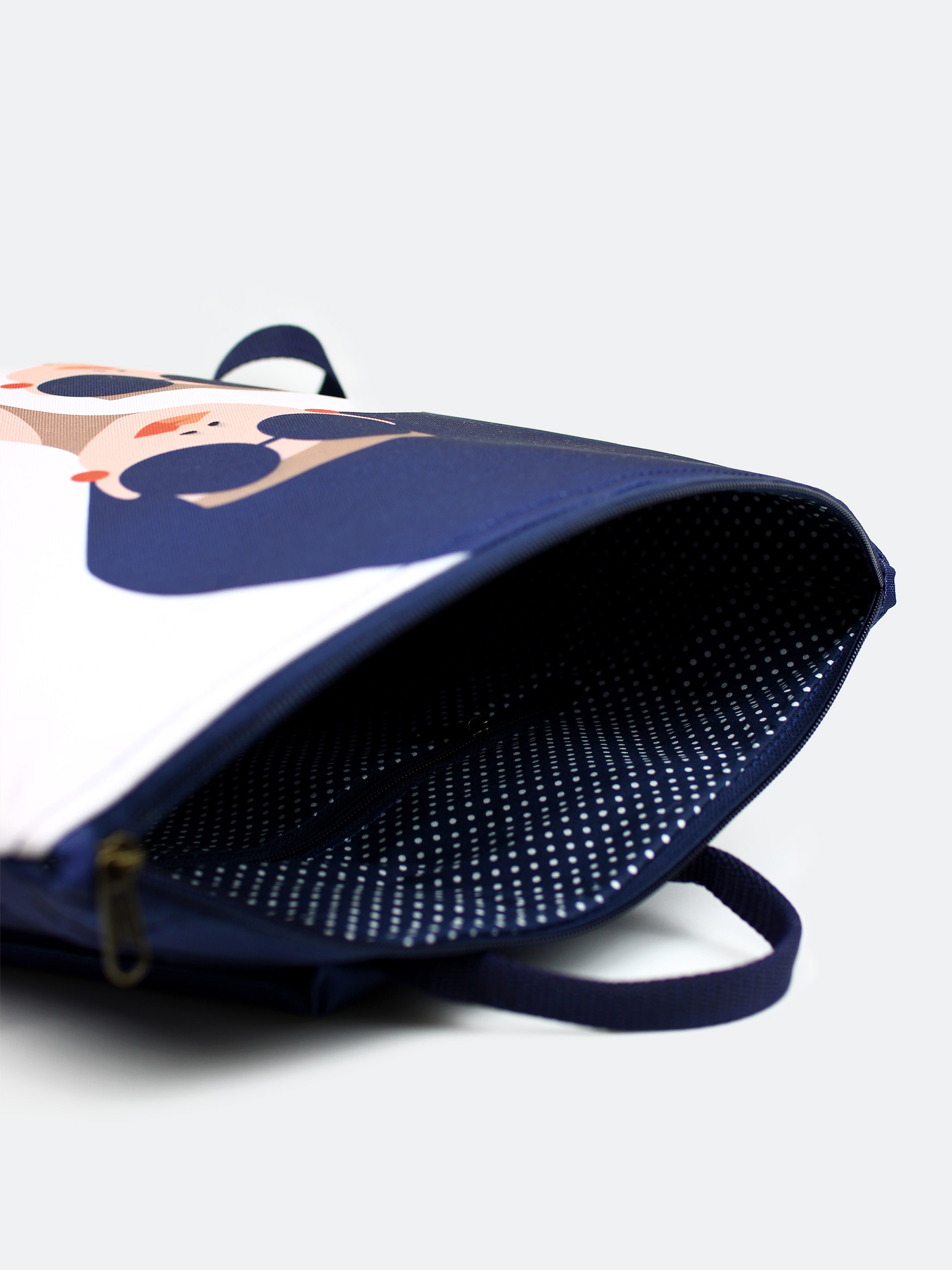 Belsejében kulcstartó karabiner, 2 nyitott és 1 nagy cipzáros, háta külső felén 23×23 cm-es cipzáros zseb található.