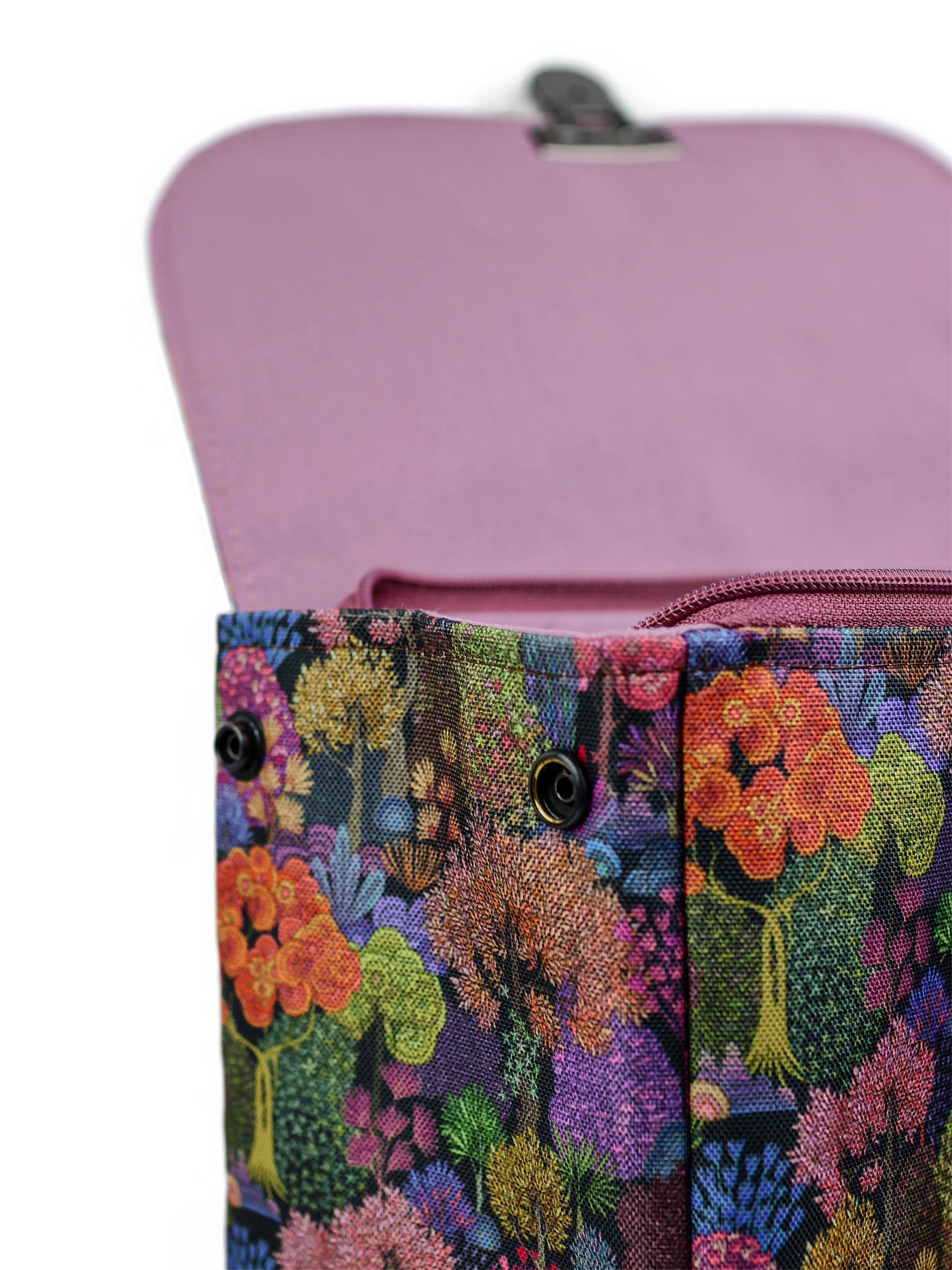 Belsejében kulcstartó karabiner, 2 nyitott és 1 nagy cipzáros, háta külső felén 25×25 cm-es cipzáros zseb kapott helyet.