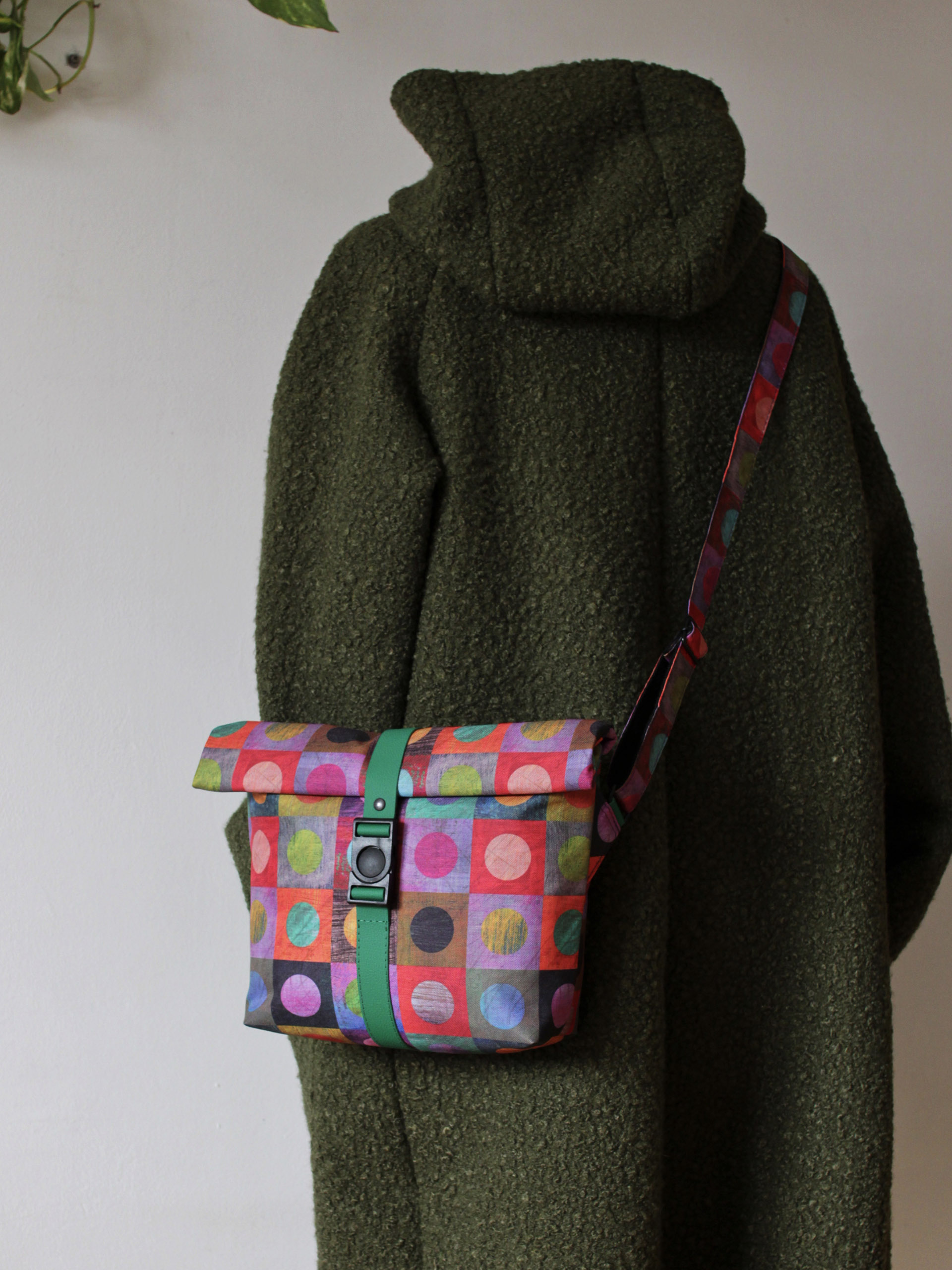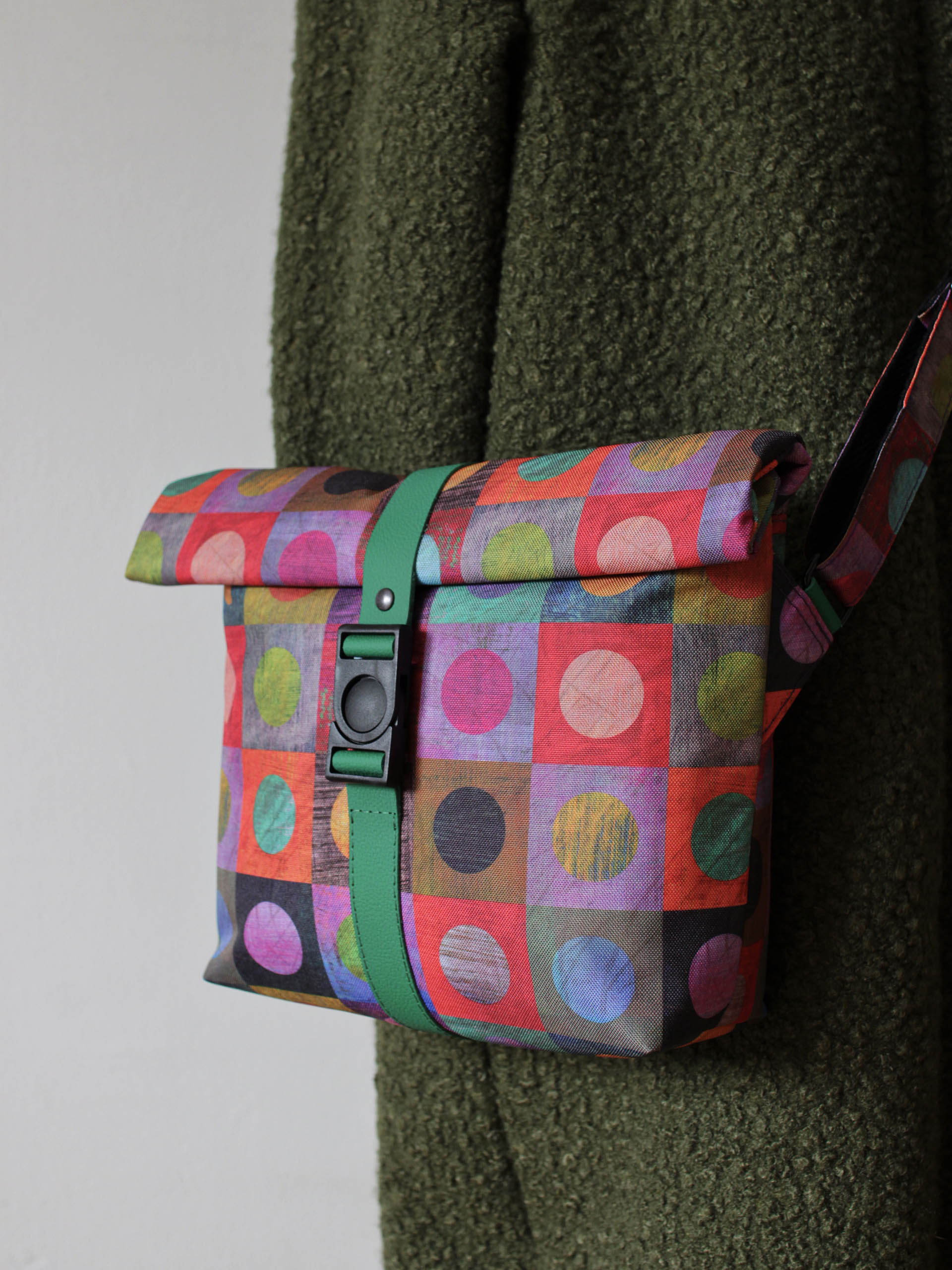 Vízálló, kisméretű, egyedi gyártású oldaltáska.